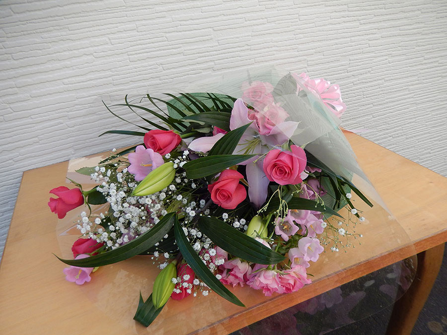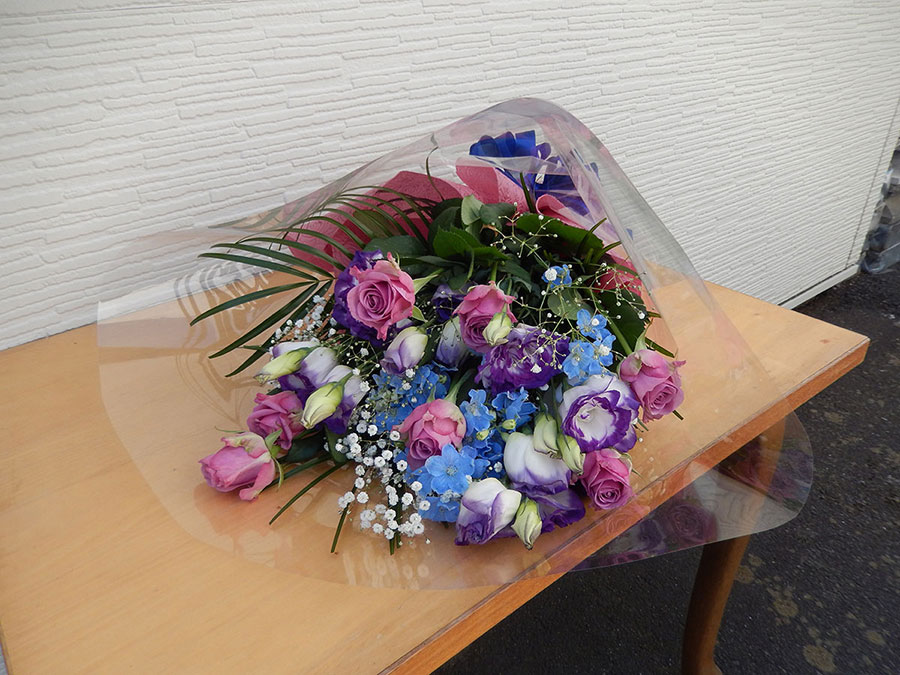 ブルー・紫系の花束。5000円。ご注文は3000円~.